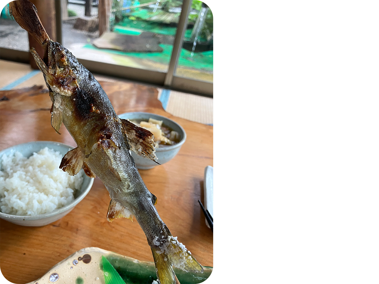 若鮎だけあって小ぶりですが、店主が炭火でじっくりと塩焼きしてますので皮はパリっと香ばしく身はふわふわで骨も柔らかく