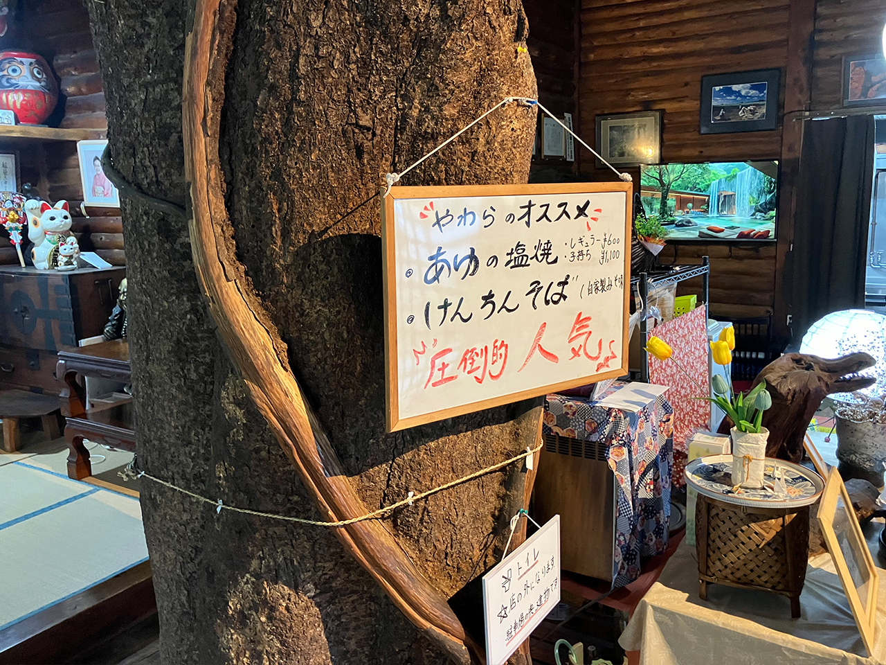 大木から切り出した立派な大きな柱が立っていてそこのホワイトボードにおすすめメニューが書いてあります。