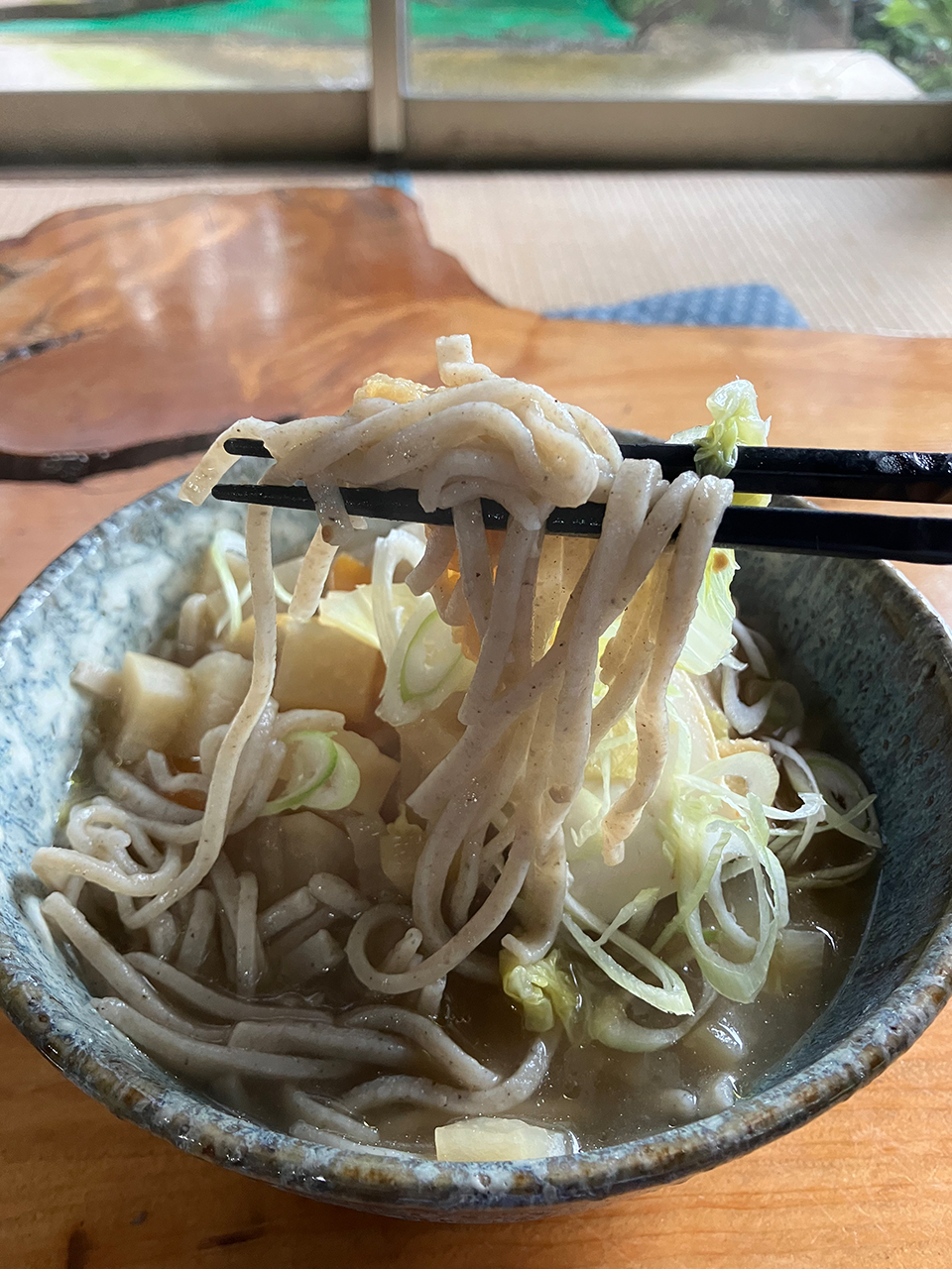 いざ、実食すると自家製味噌味のしっかりとした味噌出汁に店主の手打ちで太めにカットされた蕎麦が具材と共に絡まって食をそそる蕎麦ですね。