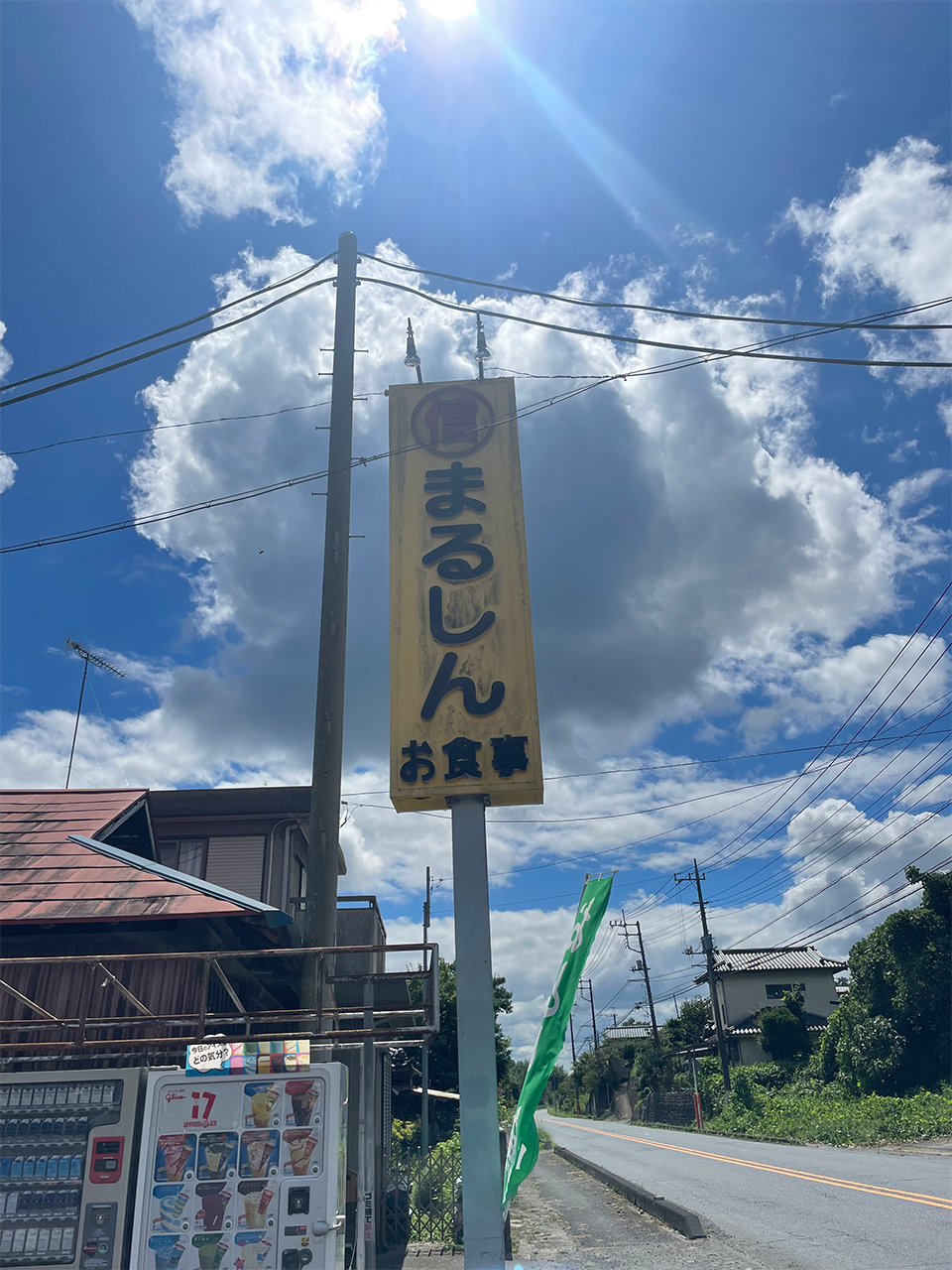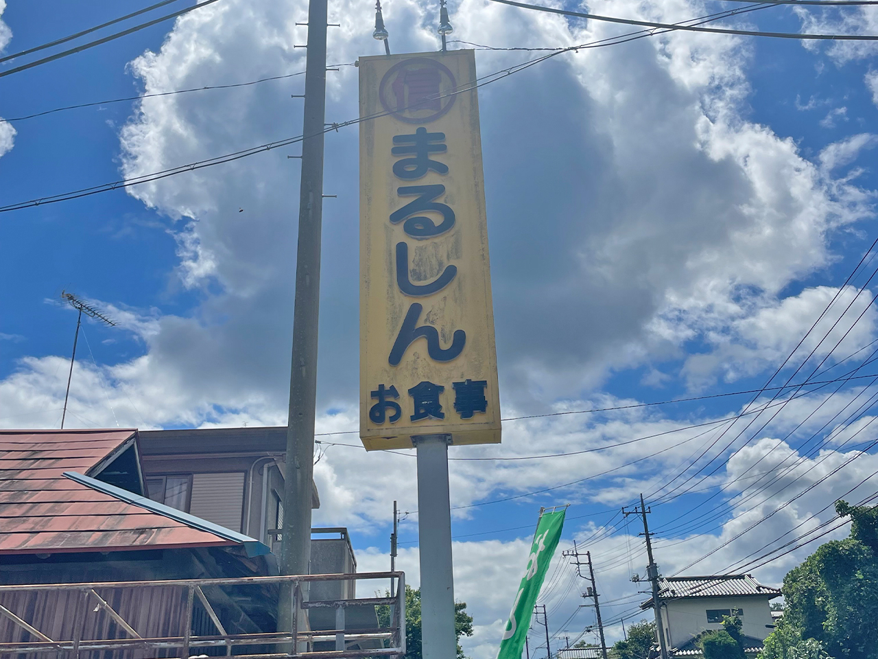 現場のすぐ近く、久慈川に架かる舟生橋のたもとに「まるしん」と書かれた看板が見えます。