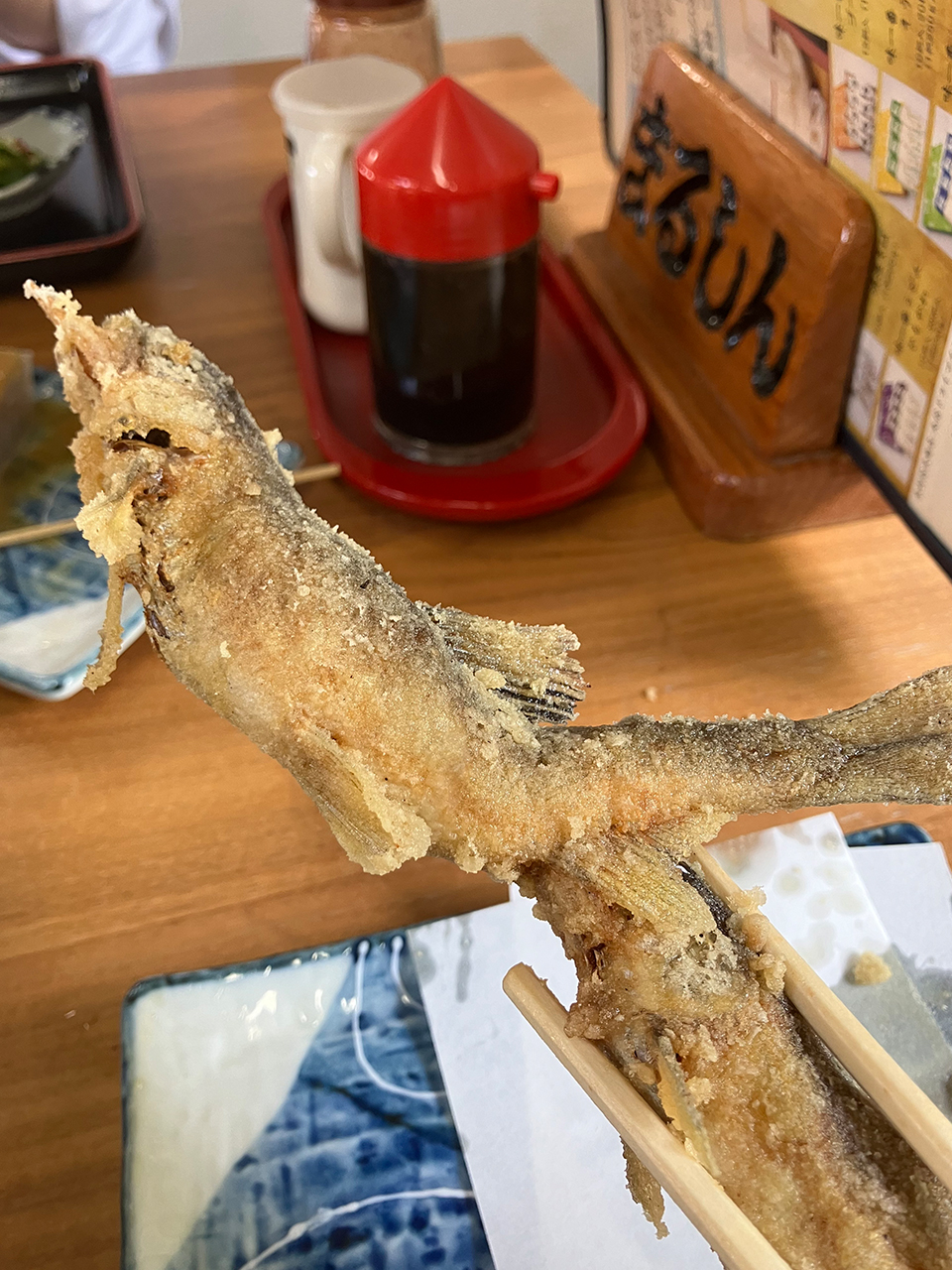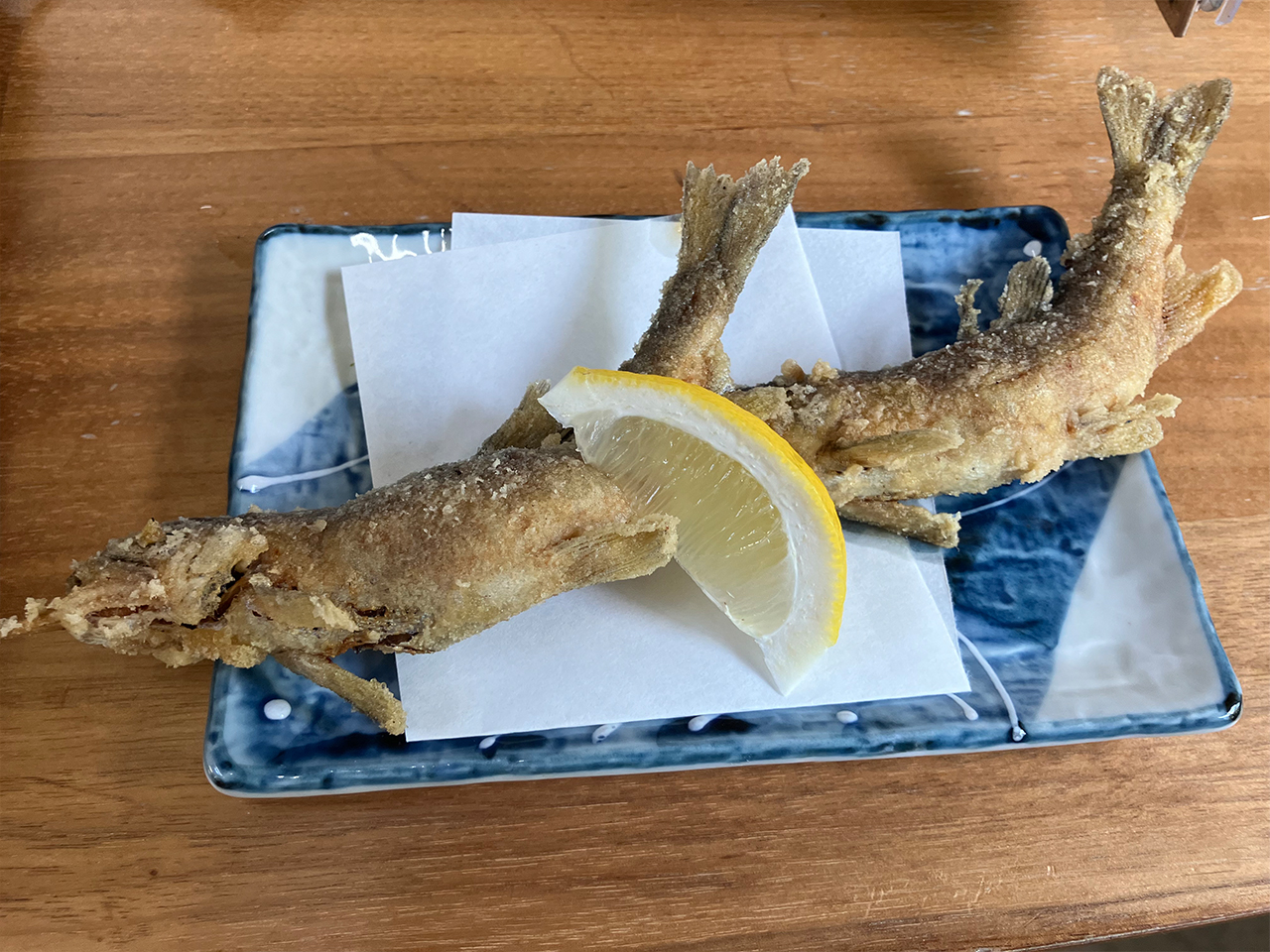 1匹まるごと揚げてあるので、外はサクサク、中はふわふわで頭から尾っぽまで骨ごと食べられます。